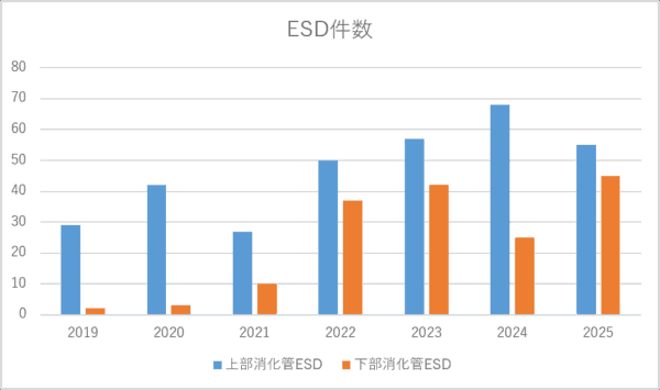 消化管腫瘍(食道、胃、大腸)に対する内視鏡治療を積極的に行っています。2004年からは内視鏡的粘膜下層剥離術(ESD)を取り入れ、病変を確実に切除出来るようになり成果を挙げています。また従来切除の困難であった大きな病変も一括切除出来るようになり内視鏡治療の適応の幅が拡大しました。2023年度のESD症例は92例施行し近年は下部消化管の症例が増加傾向にあります。また、アルゴンプラズマをはじめ各種凝固焼灼療法なども行っており、その他の内科的治療も織り交ぜた集学的な内視鏡治療を目指しています。