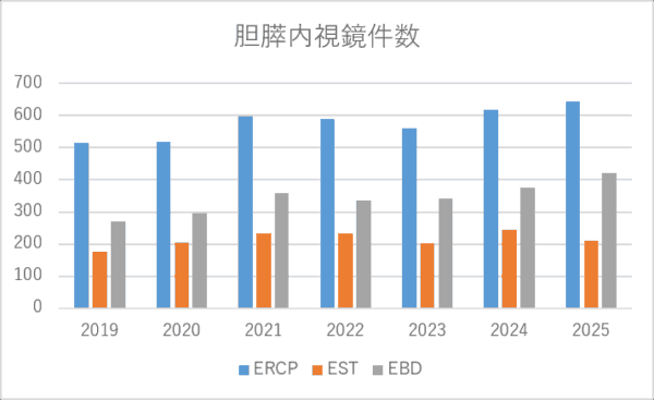当科開設1993年当初より肝胆膵疾患に対する内視鏡的診断と治療は、メインテーマとして力を注いでいます。総胆管結石に対する切石:内視鏡的乳頭切開術(EST)や、膵癌や胆道癌による閉塞性黄疸に対する内視鏡的胆道ドレナージ(EBD)の症例は極めて豊富です。2021年の膵胆道系内視鏡検査治療は年間599件(図)でした。また、超音波内視鏡下の診断、治療も導入し、2021年は超音波内視鏡下穿刺吸引生検(EUS-FNA)を年間28件施行しました。ERCP、EUSを用い胆膵疾患及び、上部消化管の粘膜下腫瘍を的確に診断した後、外科とのタイアップにより切除可能な悪性腫瘍は積極的に外科切除を行い、切除不能例に対しては外来を中心とした化学療法を行っています。